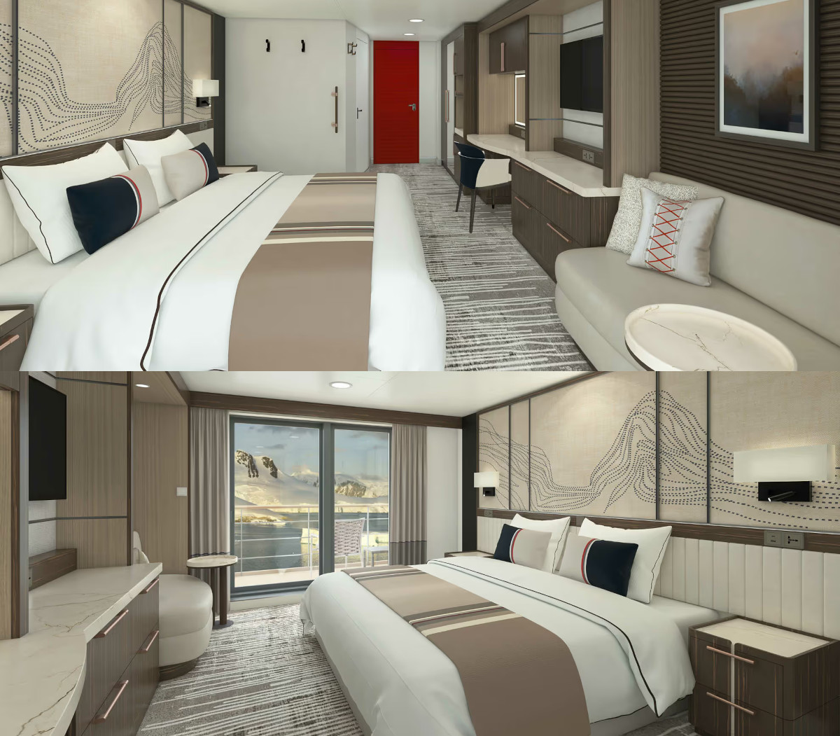 El Magellan Discoverer ofrece cinco categorías de camarotes, todos equipados con balcones privados, camas king size o twin, áreas de descanso y baños en suite modernos con ducha. Los camarotes cuentan con calefacción controlada individualmente, armarios y mobiliario elegante—ideales para relajarse después de días activos al aire libre.
