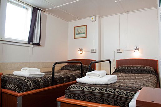 Las cabinas tienen amplio espacio para acomodar el equipaje. Son total cuenta con 46 cabinas. Cada cabina cuenta con su propio control individual para la temperatura. Todas las mañanas una camarera arreglará su cabina. La ropa de cama se cambiará una vez durante la expedición, si Usted desea que se cambie más seguido deberá solicitarlo. Las toallas de mano y de baño se cambiarán exclusivamente por pedido, tratamos de preservar el medio ambiente, para tal propósito usamos la menor cantidad posible de detergente a bordo. Si Usted deja las toallas colgadas se considera que volverá a usarlas, si las deja en el piso, consideramos que desea cambiarlas. Las cabinas no cuentan con cajas de seguridad. En caso de desear guardar objetos de valor como ser documentos o dinero, hable con el capitán del barco. La naviera no es responsable por pérdidas de efectos personales. Algunas cabinas tienen secadores de pelo.