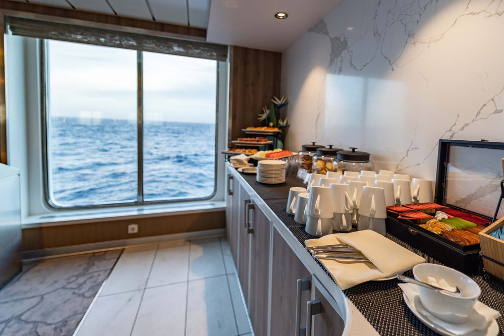 ¡Una de las partes más importantes de cualquier expedición es la comida! Independientemente de las aventuras que le depare el día, se sentirá alimentado con abundantes comidas y deliciosos tés de la mañana / tarde cocinados por nuestros chefs a bordo. Las comidas se sirven en un gran restaurante con comidas de estilo familiar, perfecto para intercambiar historias con su nueva familia de expedición. Además, un comedor privado también estará disponible bajo petición. Las comidas son un buen momento para disfrutar de la camaradería de la expedición en nuestra área de comedor con asientos abiertos. Comparta historias con sus compañeros de viaje y haga preguntas a nuestro equipo de expedición que puedan haber surgido durante el día. Té, café y bocadillos están disponibles las 24 horas del día, y nuestros chefs ofrecen diferentes opciones de menú y cursos para cada comida. Disfrute de la variedad de vino de la casa, cervezas y refrescos incluidos con la cena después de un largo día en la naturaleza. También lo invitamos a unirse a su capitán y al equipo de expedición para las bebidas informales de bienvenida y despedida del capitán, con bebidas de cortesía y aperitivos de cócteles, seguidos de una comida de 3 platos.