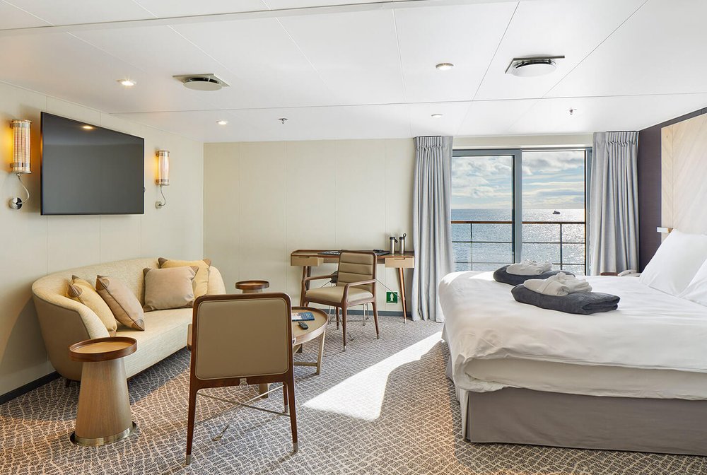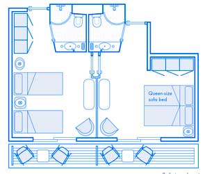 Hay 1 cabina triple suite ubicada en el deck 4, tienen capacidad para 3 personas con 2 camas individuales o 1 cama matrimonial y un sofá cama doble, 2 balcones privados con área de descanso.